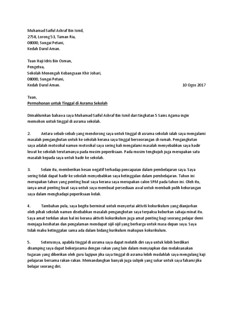 Surat Kiriman Rasmi Permohonan Untuk Tinggal Di Asrama Sekolah Pdf